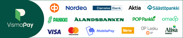 Verkkokaupan maksuvälittäjänä toimii Visma Pay (Visma Payments Oy, y-tunnus 2486559-4), joka on rekisteröity Finanssivalvonnan ylläpitämään maksulaitosrekisteriin. Maksamiseen siirrytään Visma Payn verkkopalvelun kautta ja tiliotteella ja laskulla maksun saajana näkyy Visma Pay tai Visma Payments Oy. Visma Pay välittää maksut verkkokauppiaalle. Maksaminen on turvallista, sillä kaikki maksutapahtumaa koskevat tiedot välitetään salattua yhteyttä käyttäen niin ettei kukaan ulkopuolinen taho näe maksutapahtuman tietoja. Kauppa syntyy verkkokaupan asiakkaan ja verkkokaupan välille. Verkkokaupan vastuulla ovat kaikki kauppaan liittyvät velvoitteet.